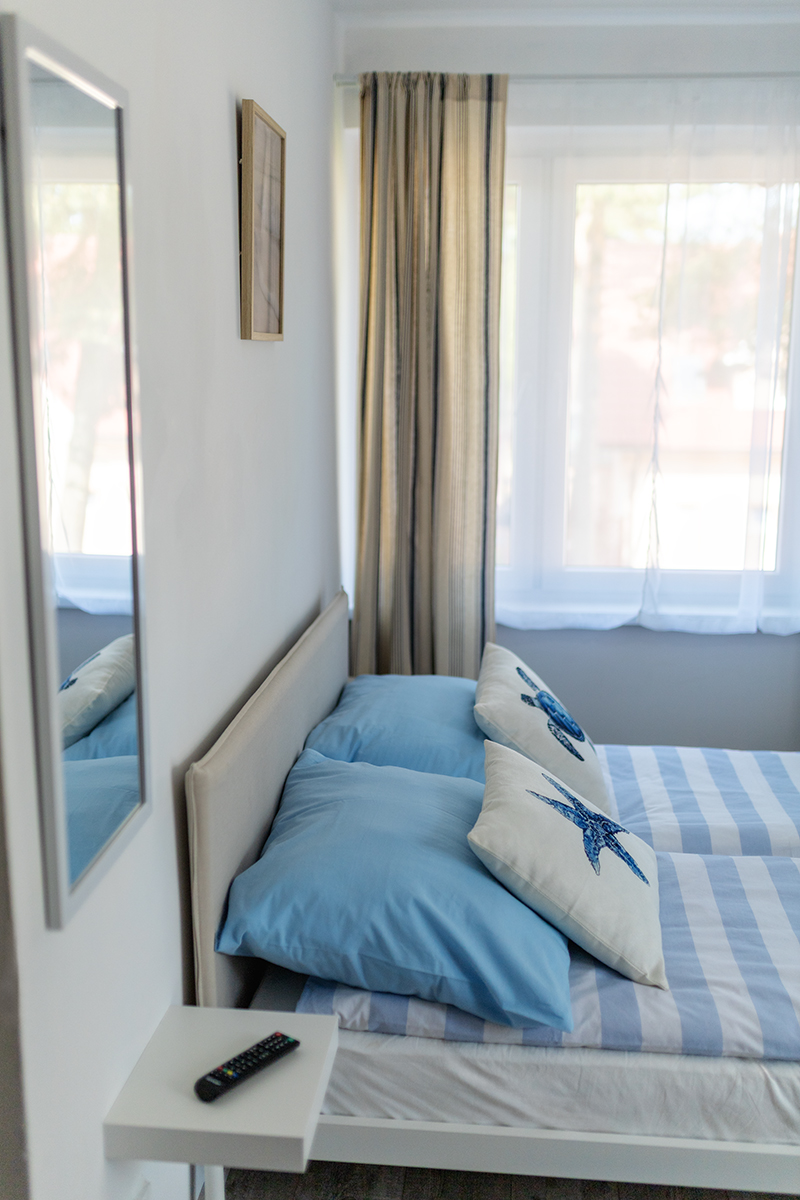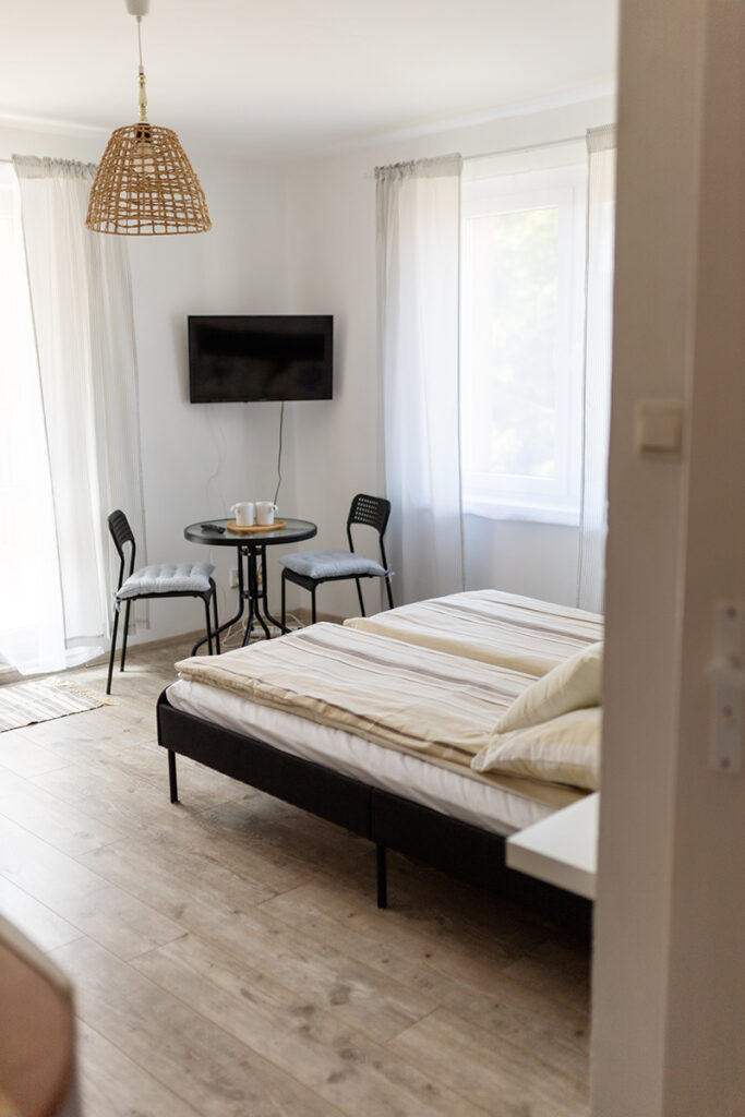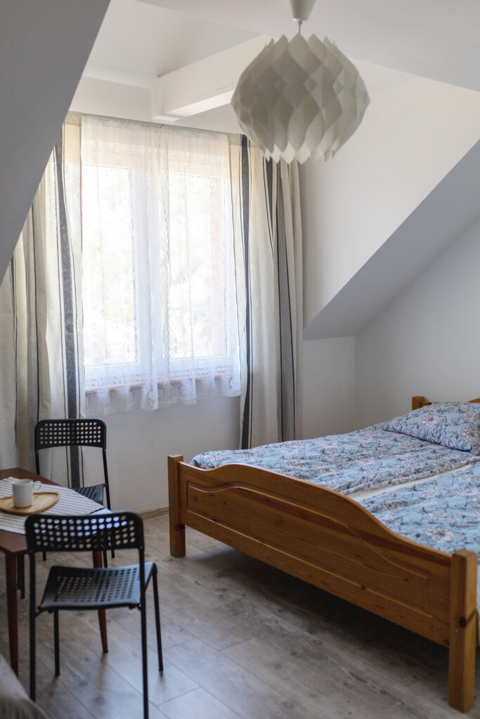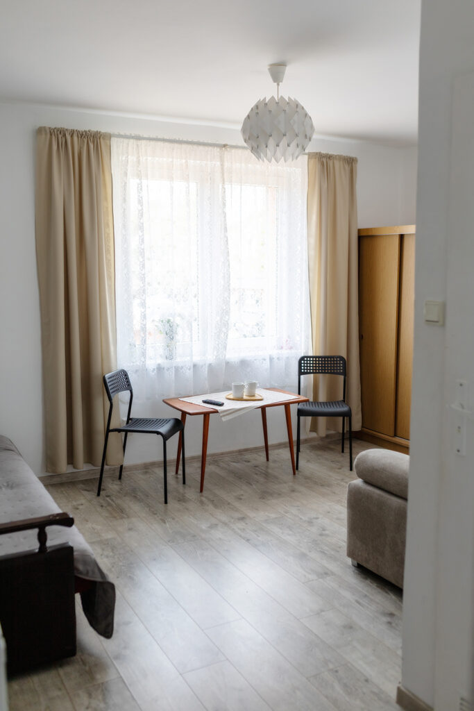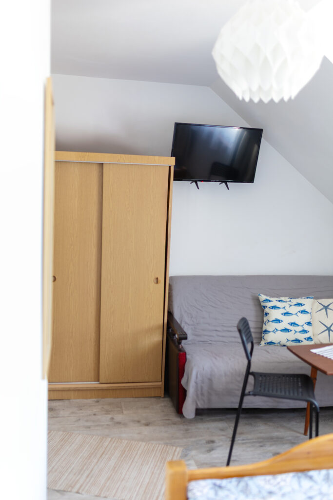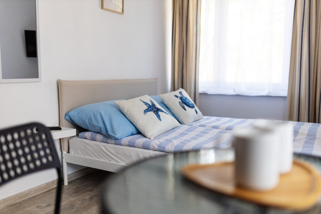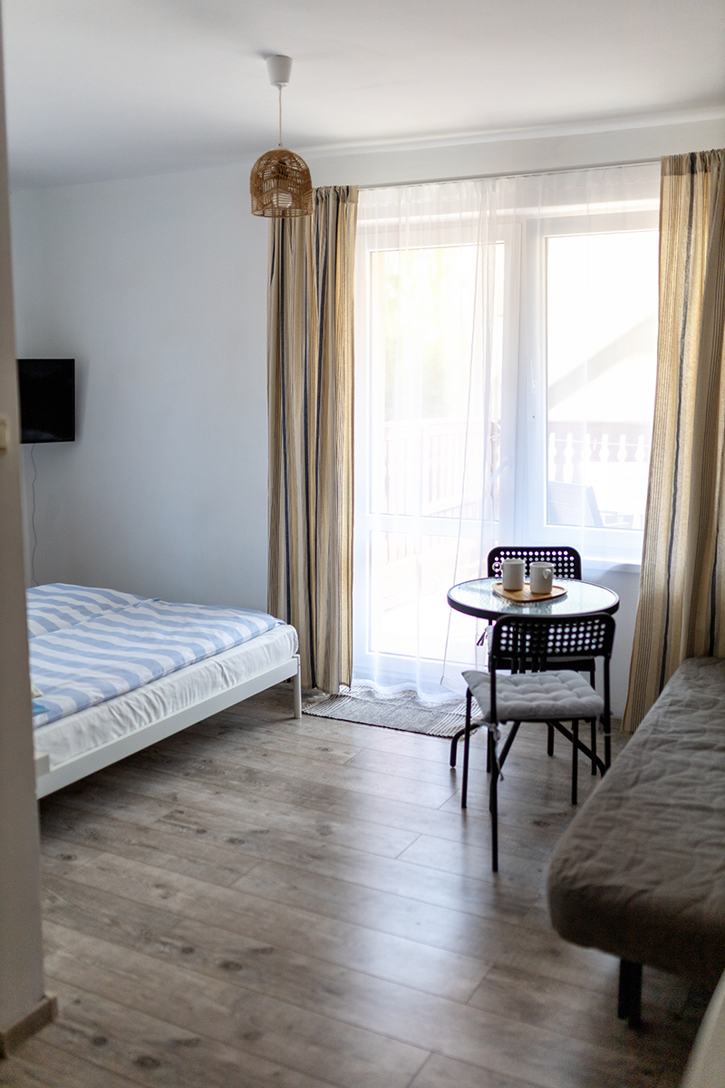 Do Państwa dyspozycji oddajemy pokoje 2, 3 i 4 osobowe jak również typu Studio dwupokojowe-siedmioosobowe (zdjęcia studia poniżej w galerii), z pełnym węzłem sanitarnym, wyposażone w TV, wi-fi, podstawowe naczynia i sztućce, czajnik elektryczny, lodówkę, leżaki, karimaty i parawan. Posiadamy dwa pokoje z balkonem i dwa z tarasem.